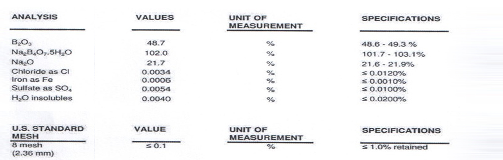 產(chǎn)品簡(jiǎn)介 五水硼砂俗名為五水四硼酸鈉,分子式Na2B4O7•5H2O,相對(duì)分子質(zhì)量291.29。白色結(jié)晶狀粉末,122℃時(shí)失去結(jié)晶水,相對(duì)密度1.815,具有消毒、殺菌、助熔,及高黏著性能。原裝進(jìn)口的美國(guó)車馬牌五水硼砂為25公斤/包。純度達(dá)101.5%~103.5%,三氧化二硼含量為48.5~49.5%。每批產(chǎn)品都備有原廠的出廠檢驗(yàn)報(bào)告,并已進(jìn)行SGS測(cè)試,測(cè)試結(jié)果完全符合歐盟標(biāo)準(zhǔn)RoHS規(guī)定。